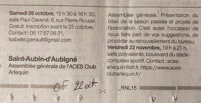 Info-Locale 22 octobre 2024 : Assemblée générale Arlequin du 22 novembre 2024