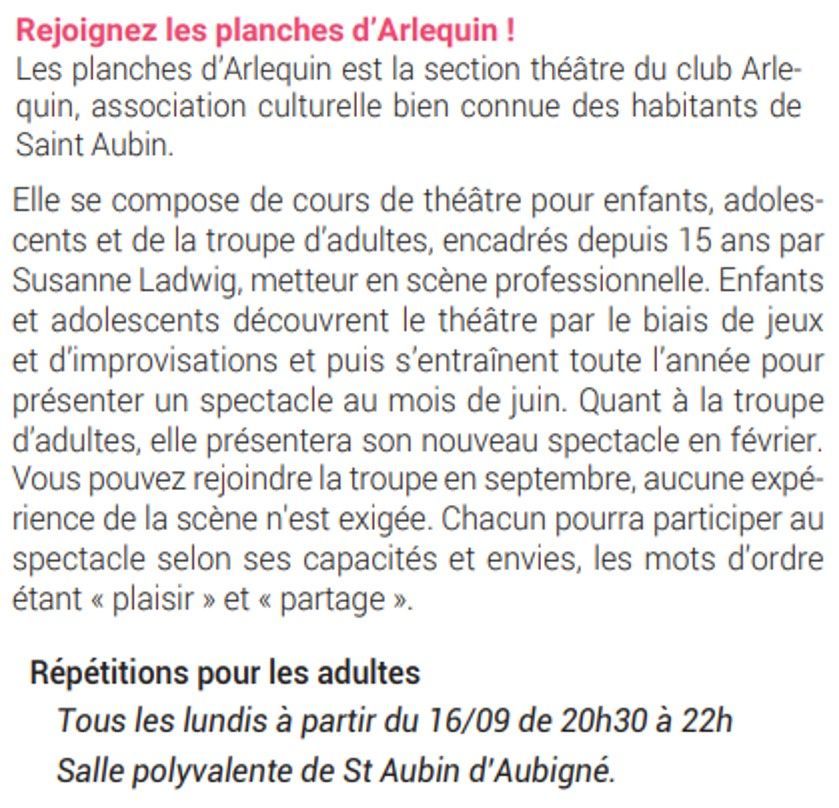 St-Aubin-Info 226 Juil.-Août-Sept. 2024 : Théâtre : Rejoignez les planches Arlequin